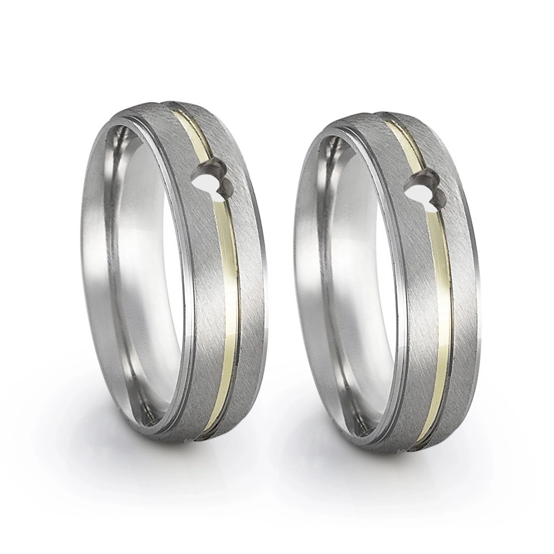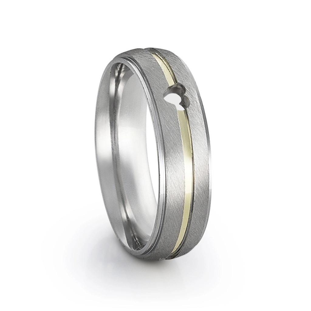 Aliança de aço levemente anatômica com filete em ouro e detalhe de coração vazado.
