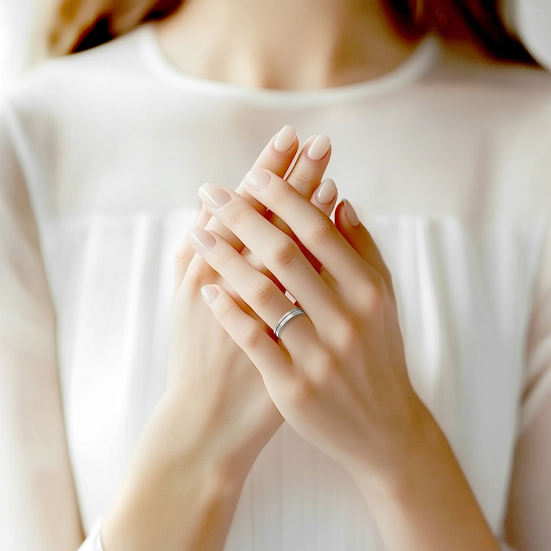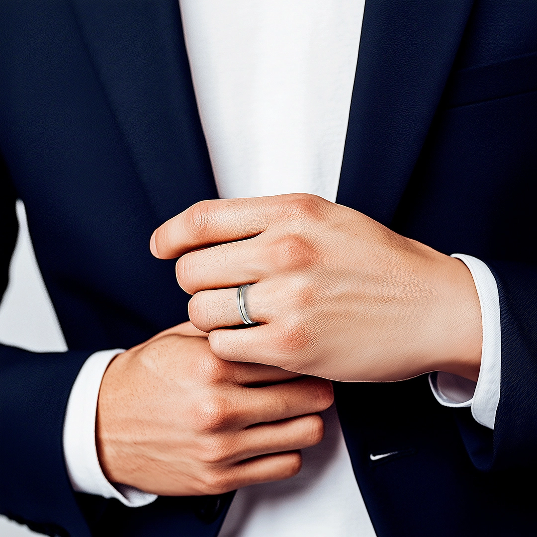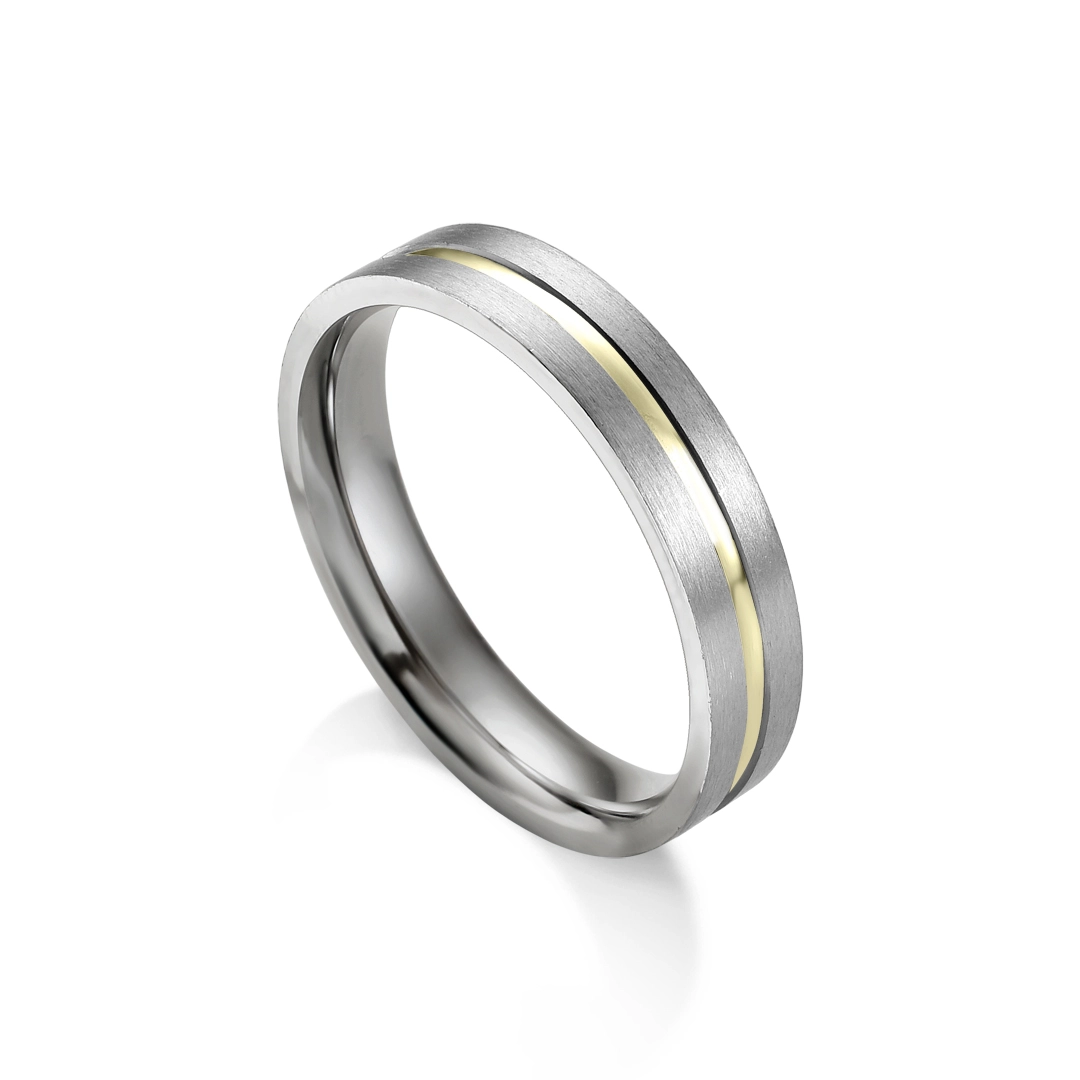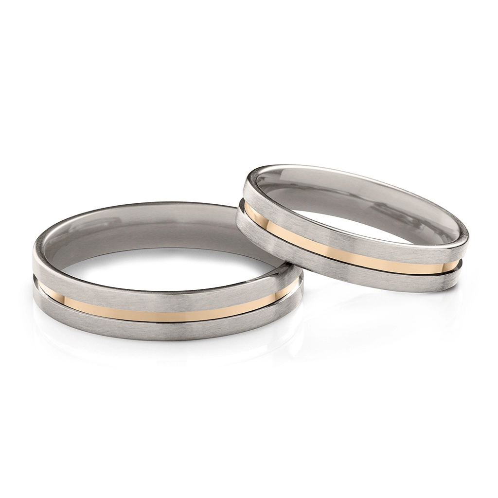 Aliança delicada adornada com filete em ouro e levemente anatômica.