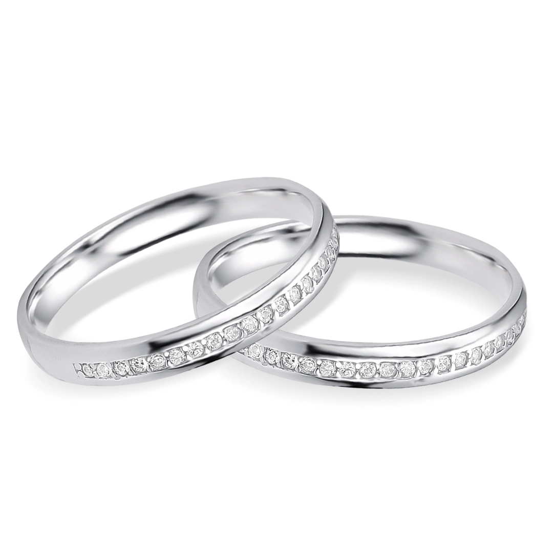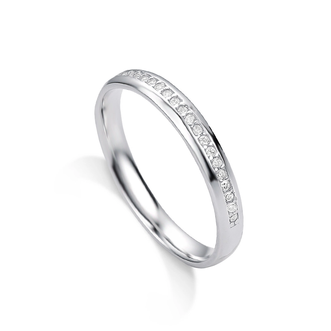 Aliança levemente anatômica espelhada com zircônias cravejadas.