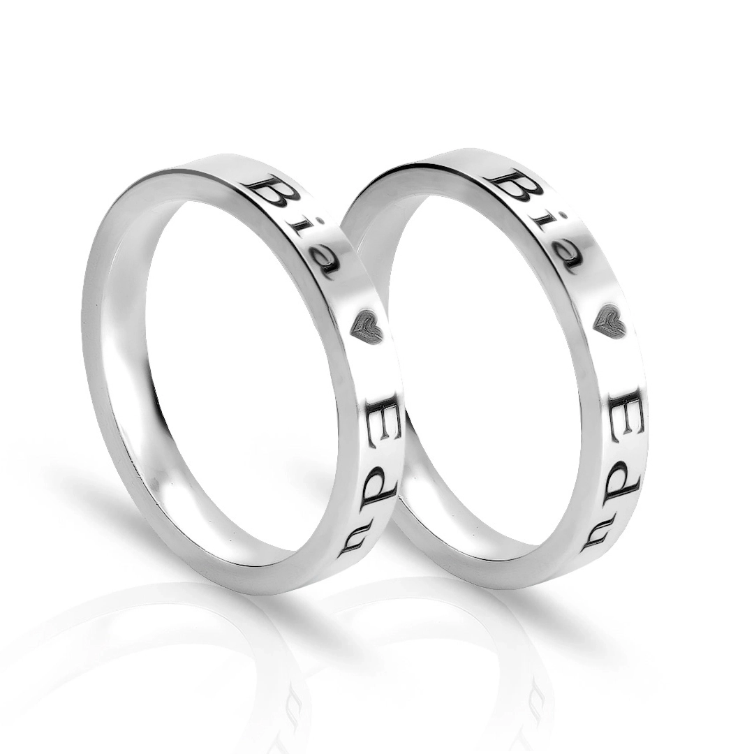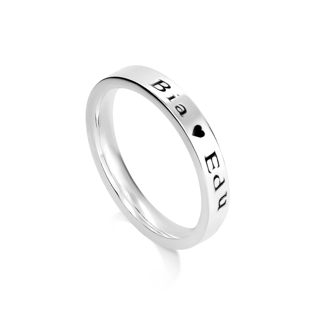 Aliança anatômica espelhada com bordas retas personalizada com gravação externa.