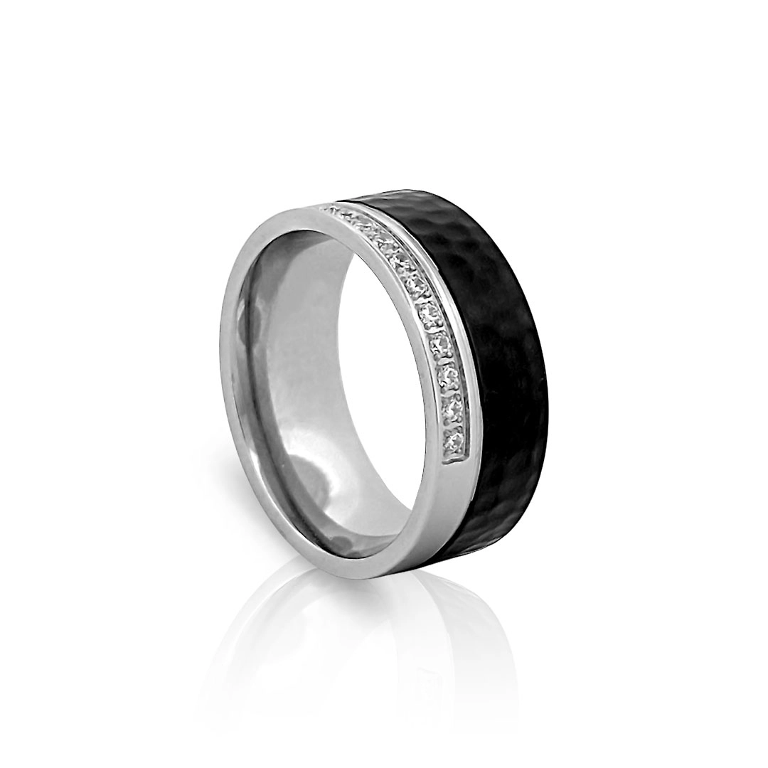 Anel em fibra de carbono com borda espelhada com zircônias cristal cravejadas.