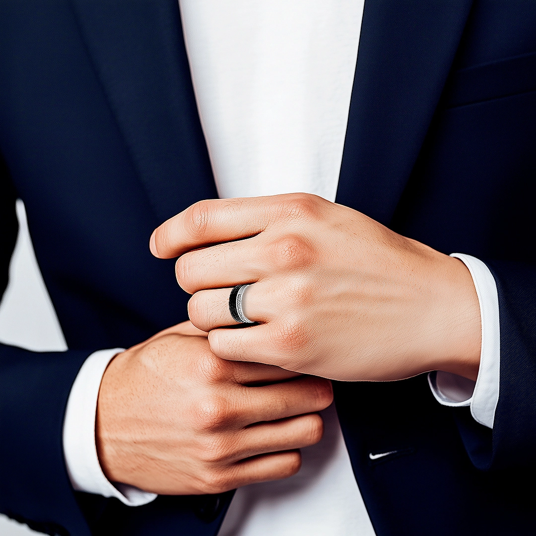 Anel de Aço com Fibra de Carbono e Borda Espelhada Com Zircônias Cristal