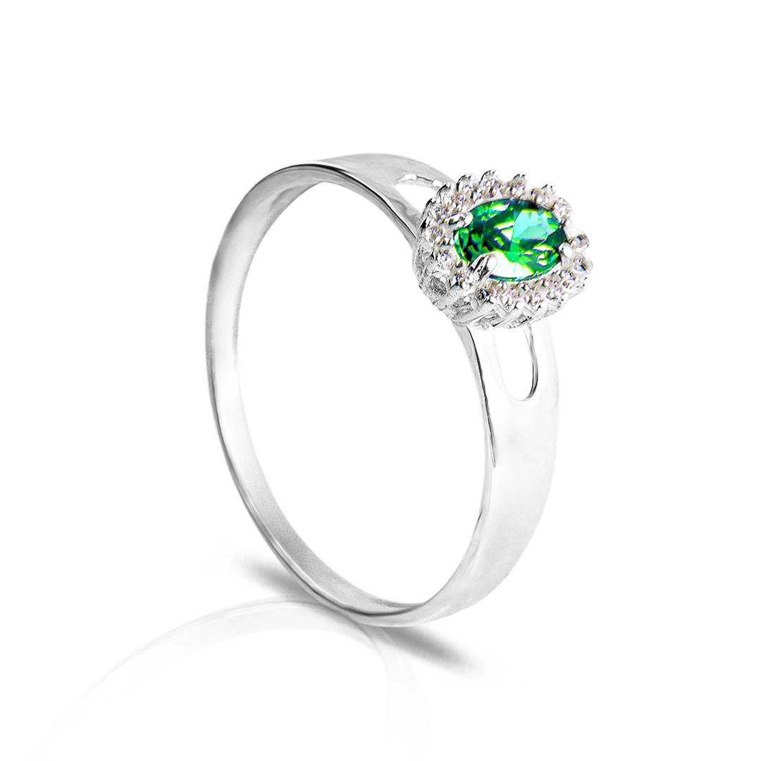 Anel de prata com zircônia esmeralda e zircônia cristal.