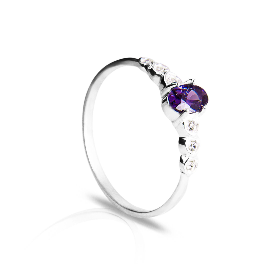 Anel de prata com zircônia ametista oval e zircônia cristal.