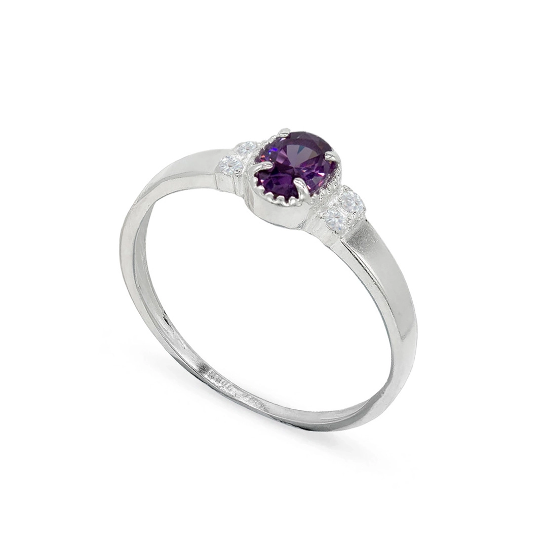 Anel de prata com zircônia amestista oval e zircônia cristal.