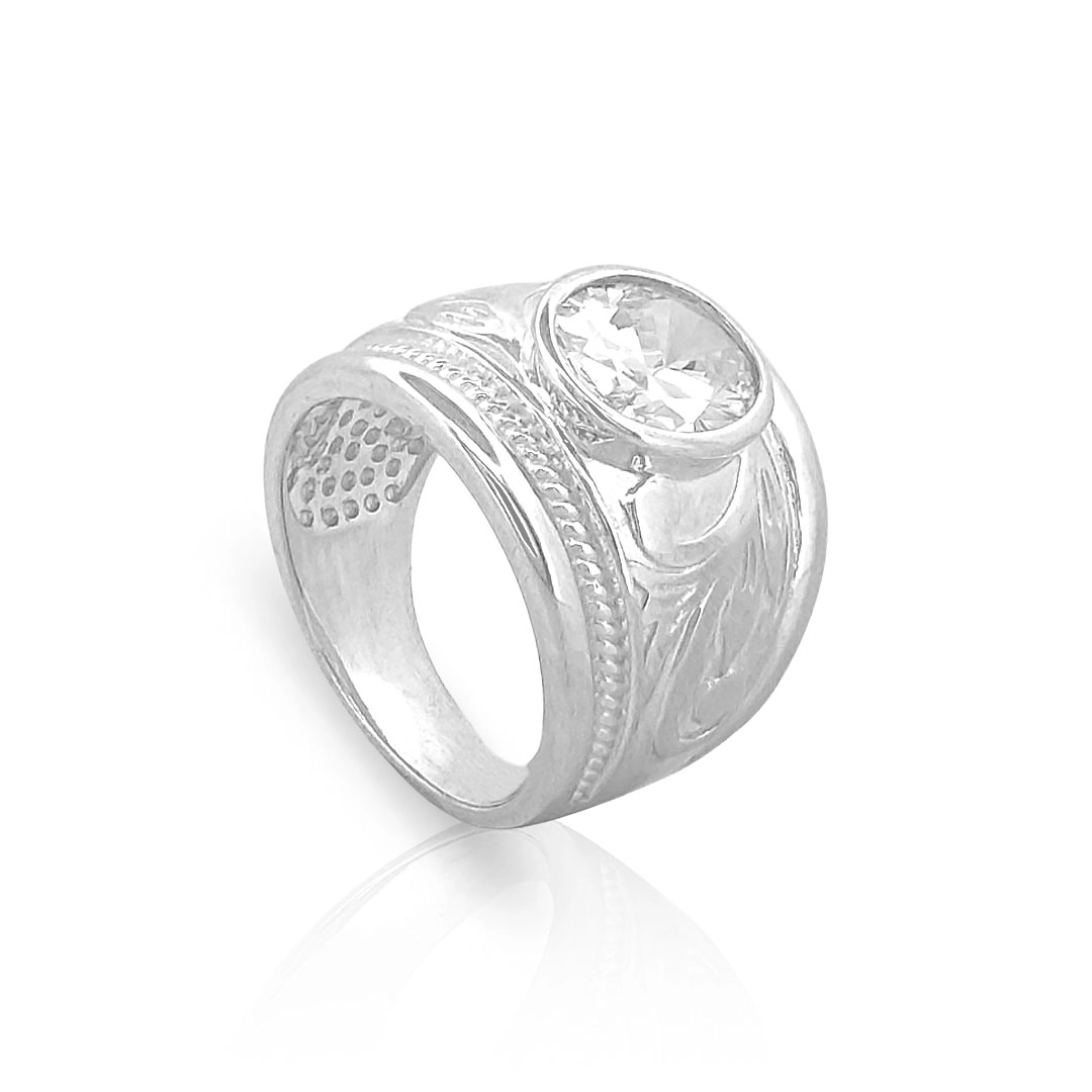 Anel espelhado com trabalhado e zircônia cristal em formato oval.