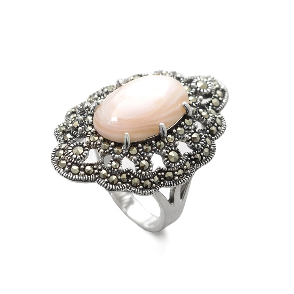 Anel de Prata com Madrepérola Rosa Oval e Marcassitas