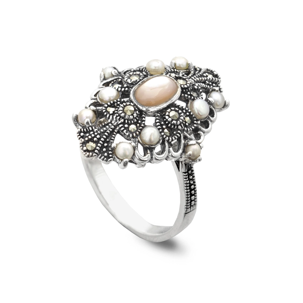 Anel de Prata com Madrepérola Rosa Oval, Marcassitas e Pérolas Sintetizadas