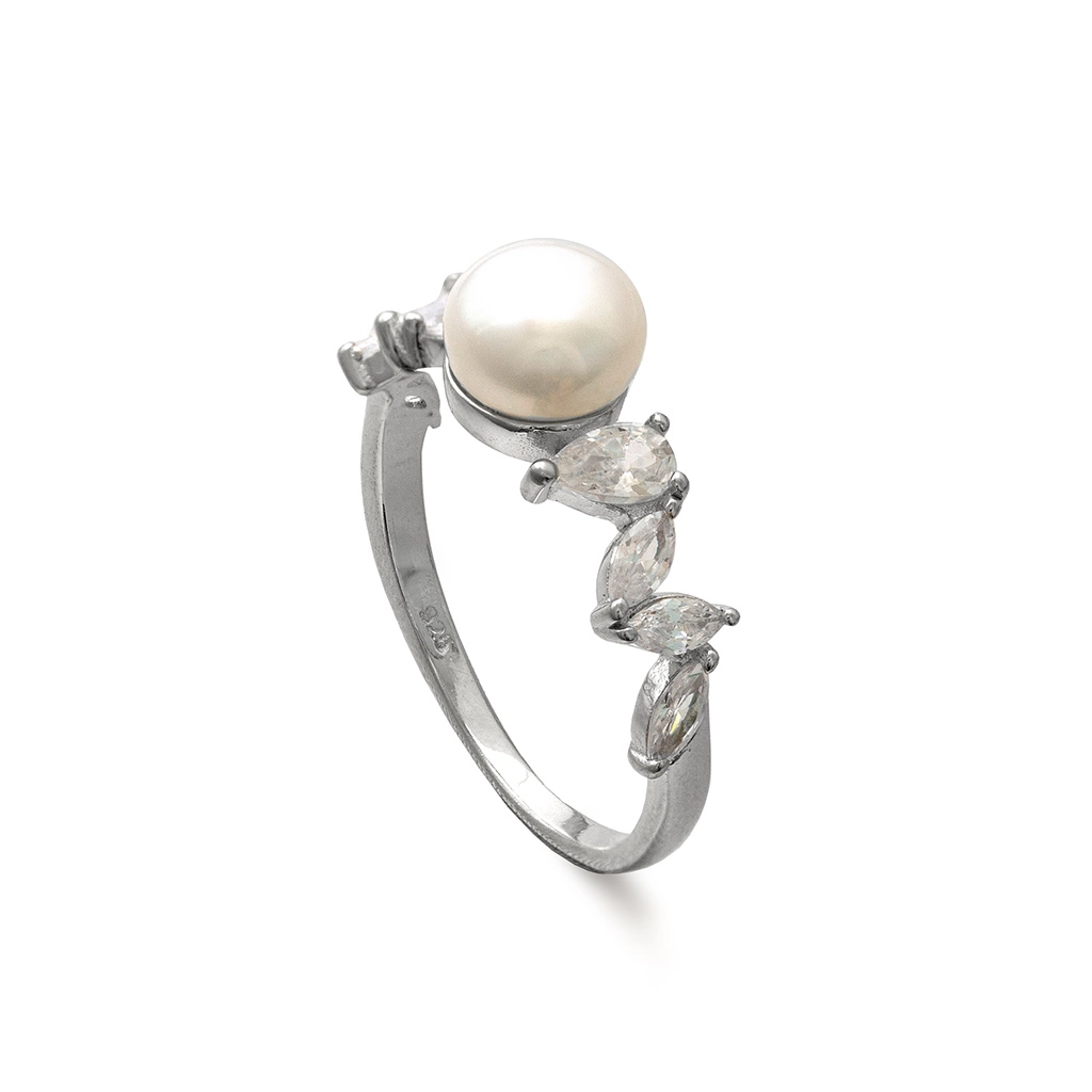 Anel de Prata com Pérola Biwa e Zircônia Cristal Gota e Navete