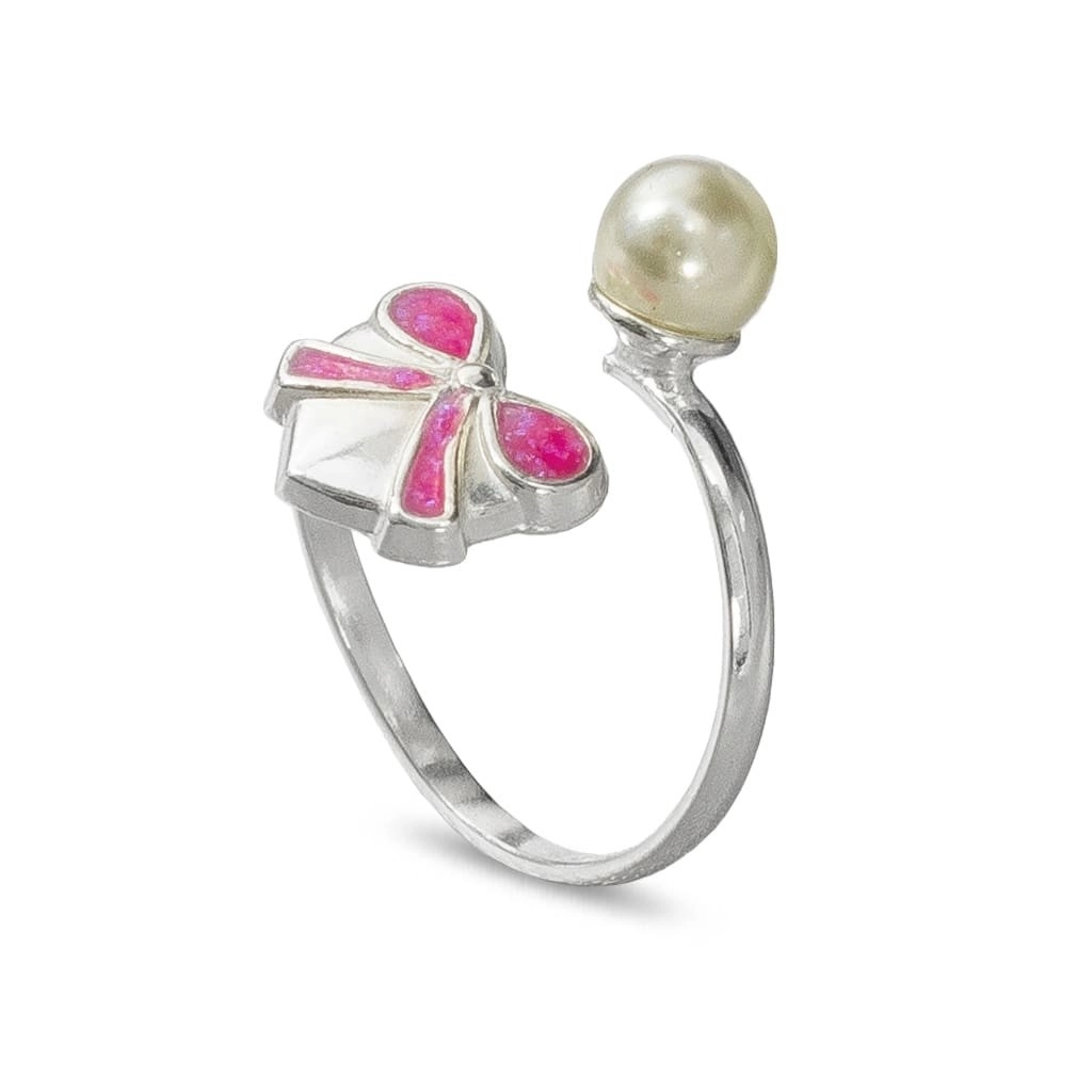 Anel infantil espelhado, regulável em formato de coração com laço rosa esmaltado e pérola.