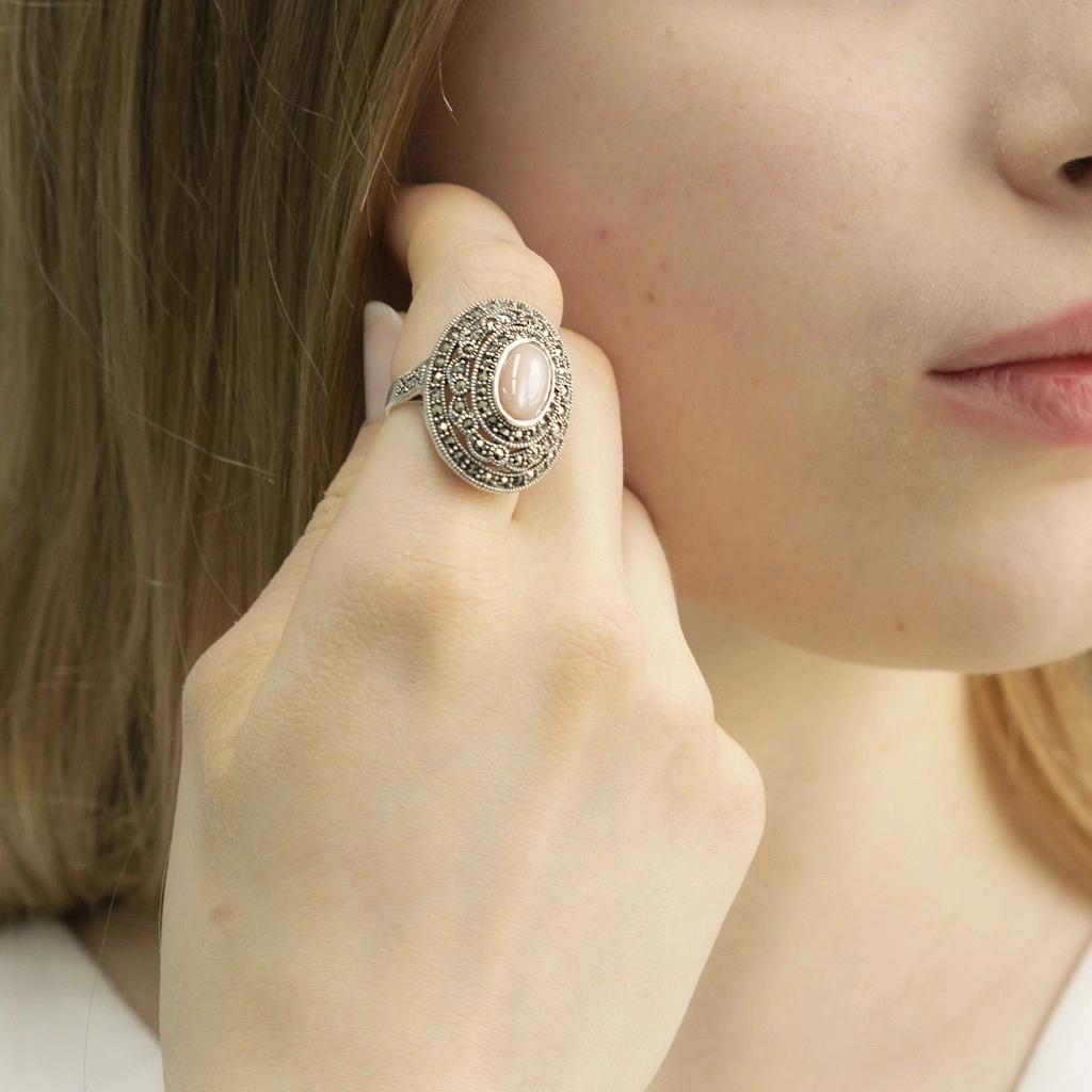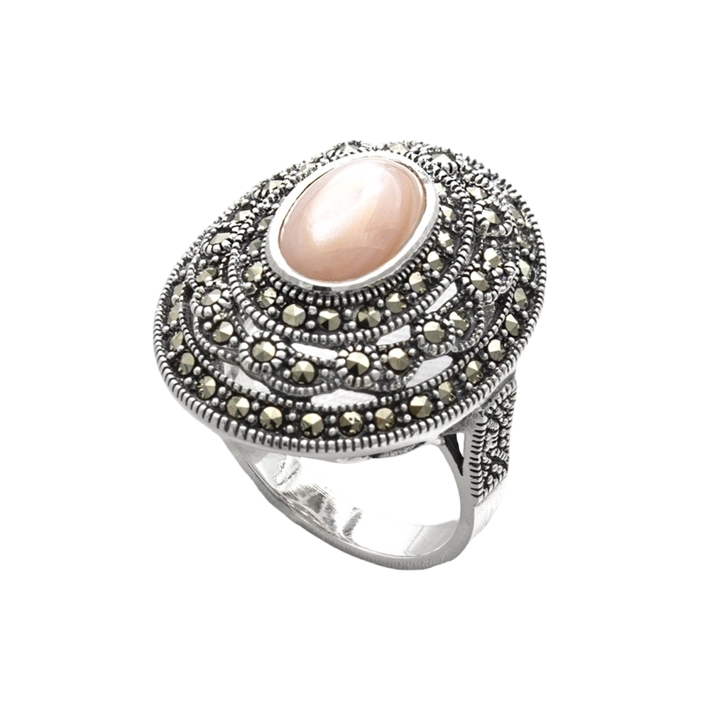 Anel de Prata Oval com Madrepérola Rosa e Marcassitas