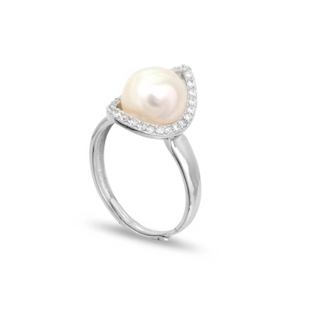 Anel de Prata Regulável Navete com Pérola Biwa e Zircônia Cristal
