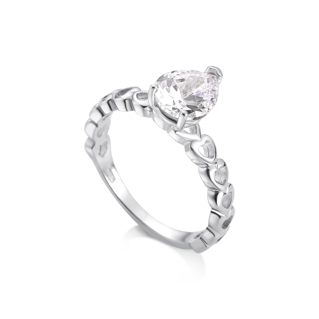 Anel de Prata Solitário com Zircônia Cristal Gota e Aro de Corações