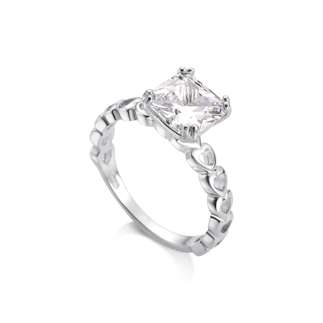 Anel de Prata Solitário com Zircônia Cristal Quadrada e Aro de Corações