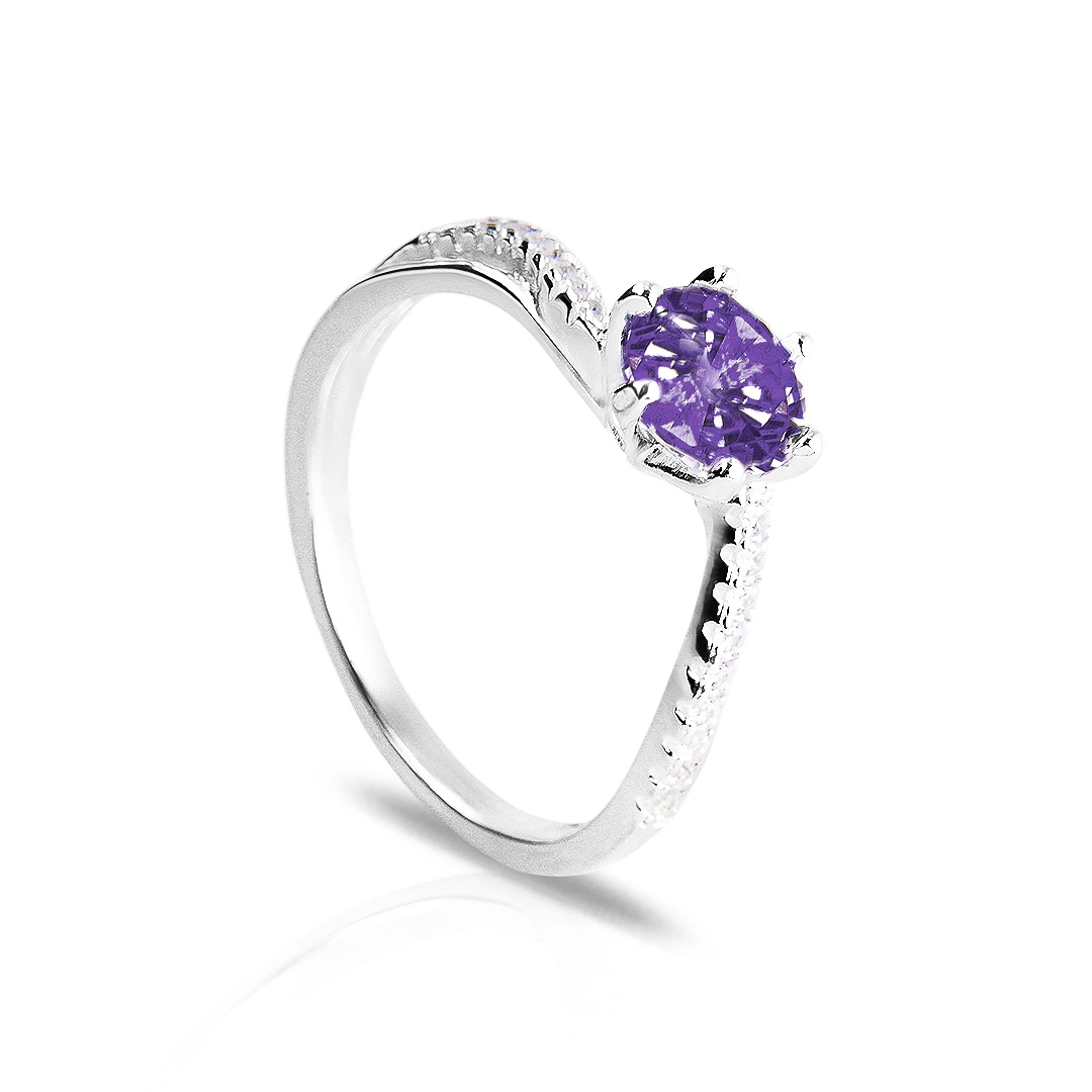 Anel de aro trabalhado com zircônias cristal e pedra principal de zircônia ametista.