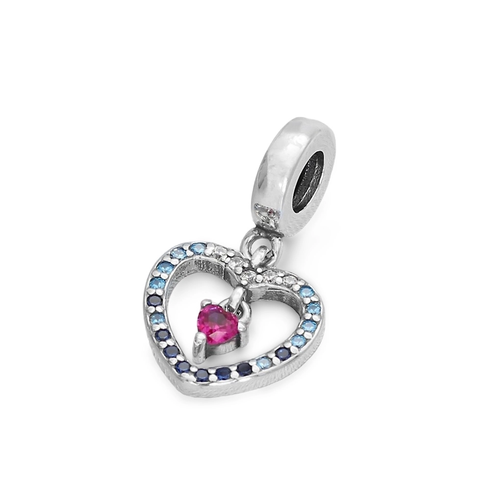 Berloque de Prata Balanço Coração Vazado com Zircônia Safira e Zircônia Rubi