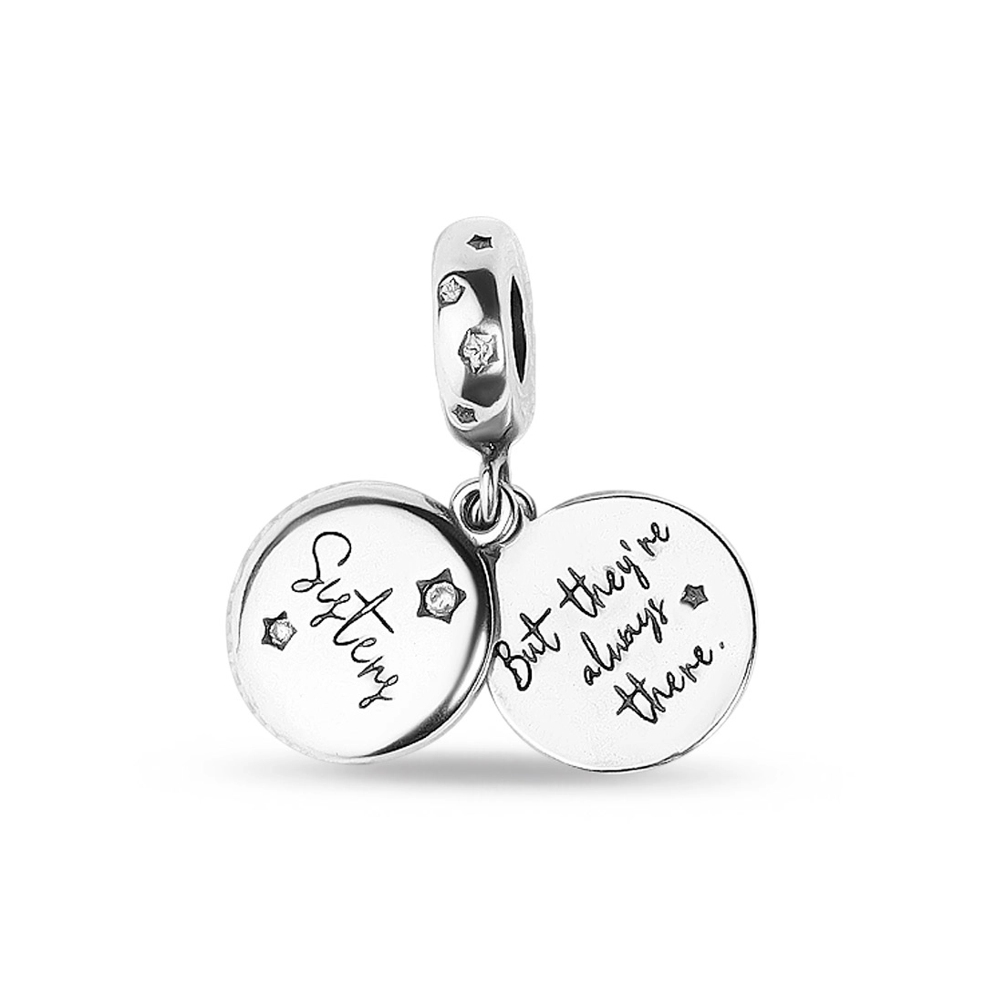 Berloque balanço com chapa redonda dupla com escrita "Sisters you don't always see them but they're always there".