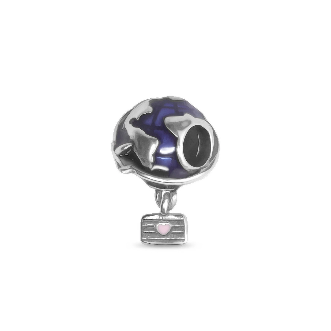 Berloque de Prata com Globo Azul Esmaltado e Mala com Coração Rosa