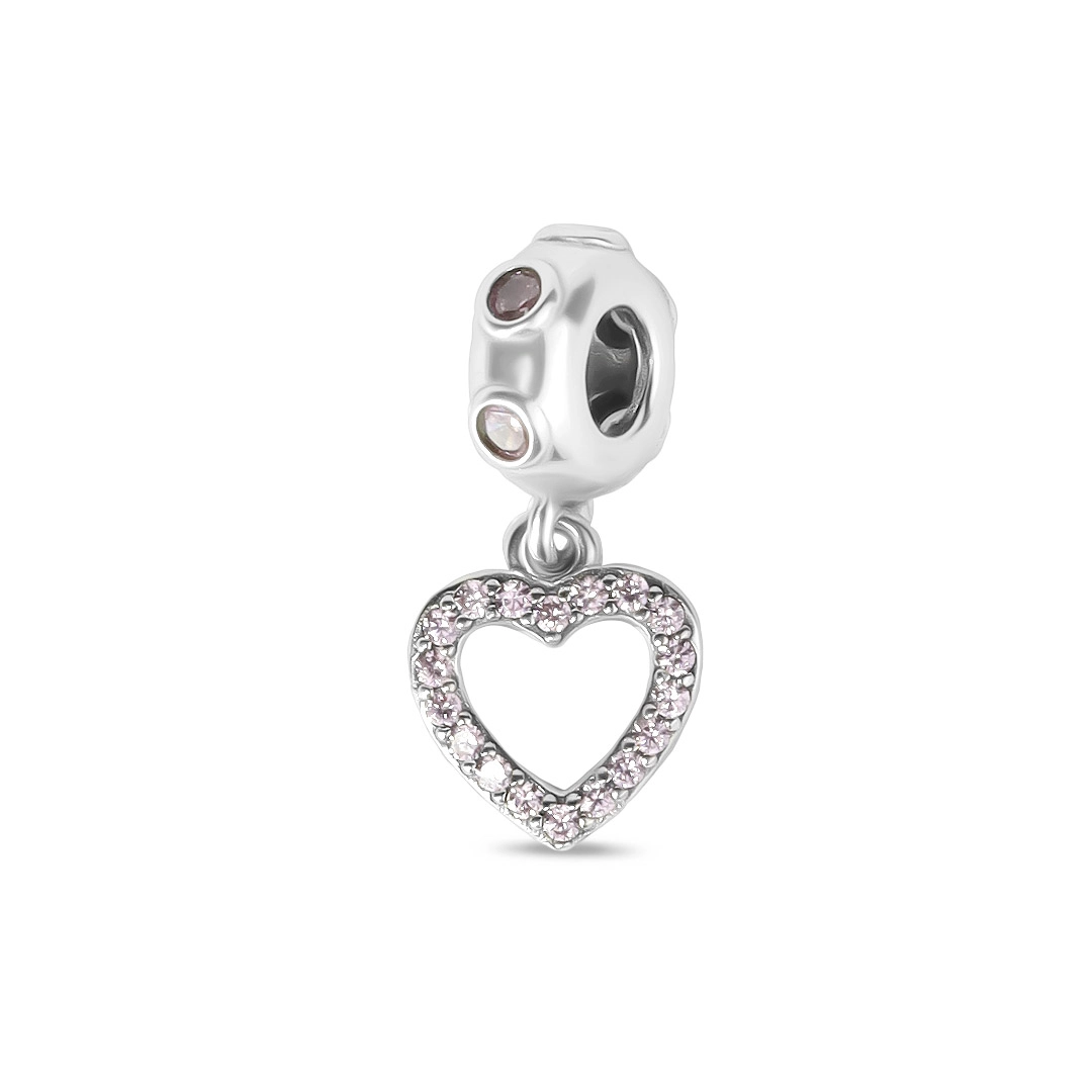 Berloque de Prata Coração Vazado e Zircônia Rosa