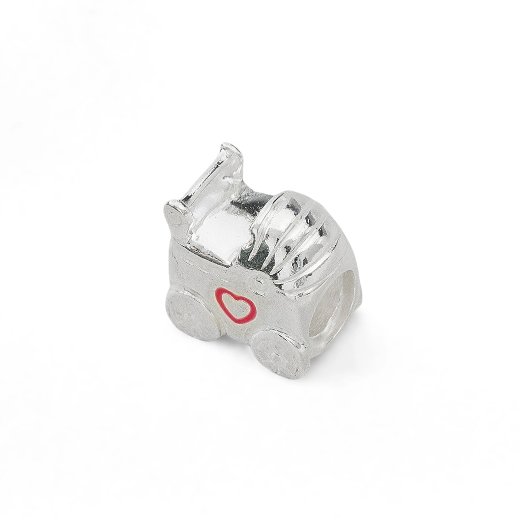 Berloque de Prata Carrinho de Bebê com Coração Rosa
