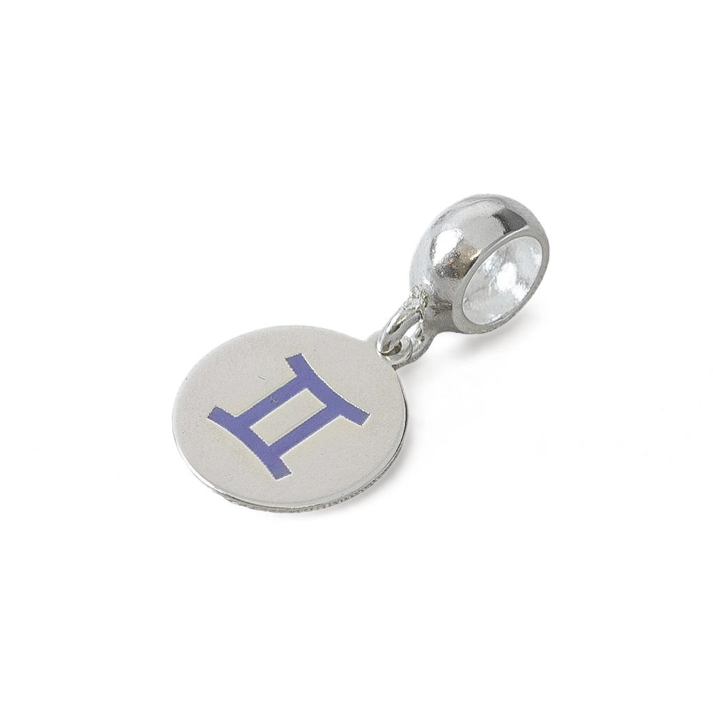 Pingente em formato redondo, que possui signo gêmeos no tom azul claro esmaltado.
