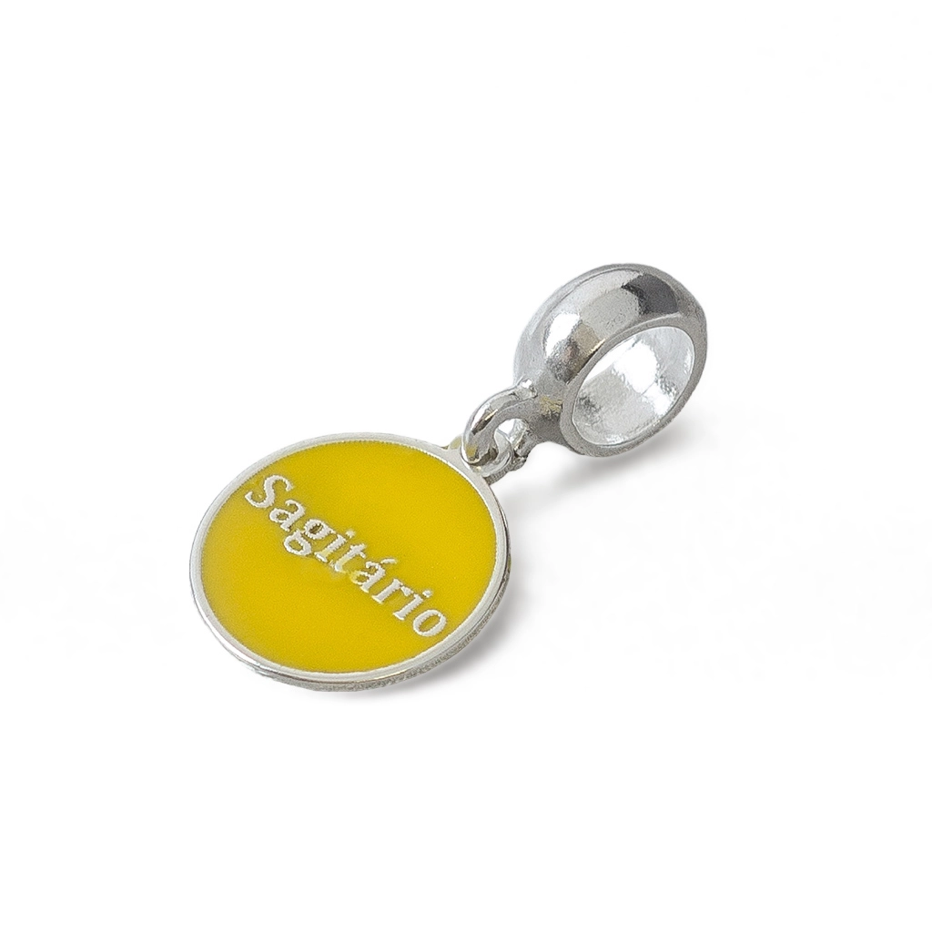 Pingente em formato redondo, que possui signo sagitário no tom amarelo esmaltado.