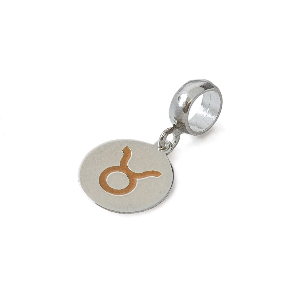 Pingente em formato redondo, que possui signo touro no tom marrom esmaltado.