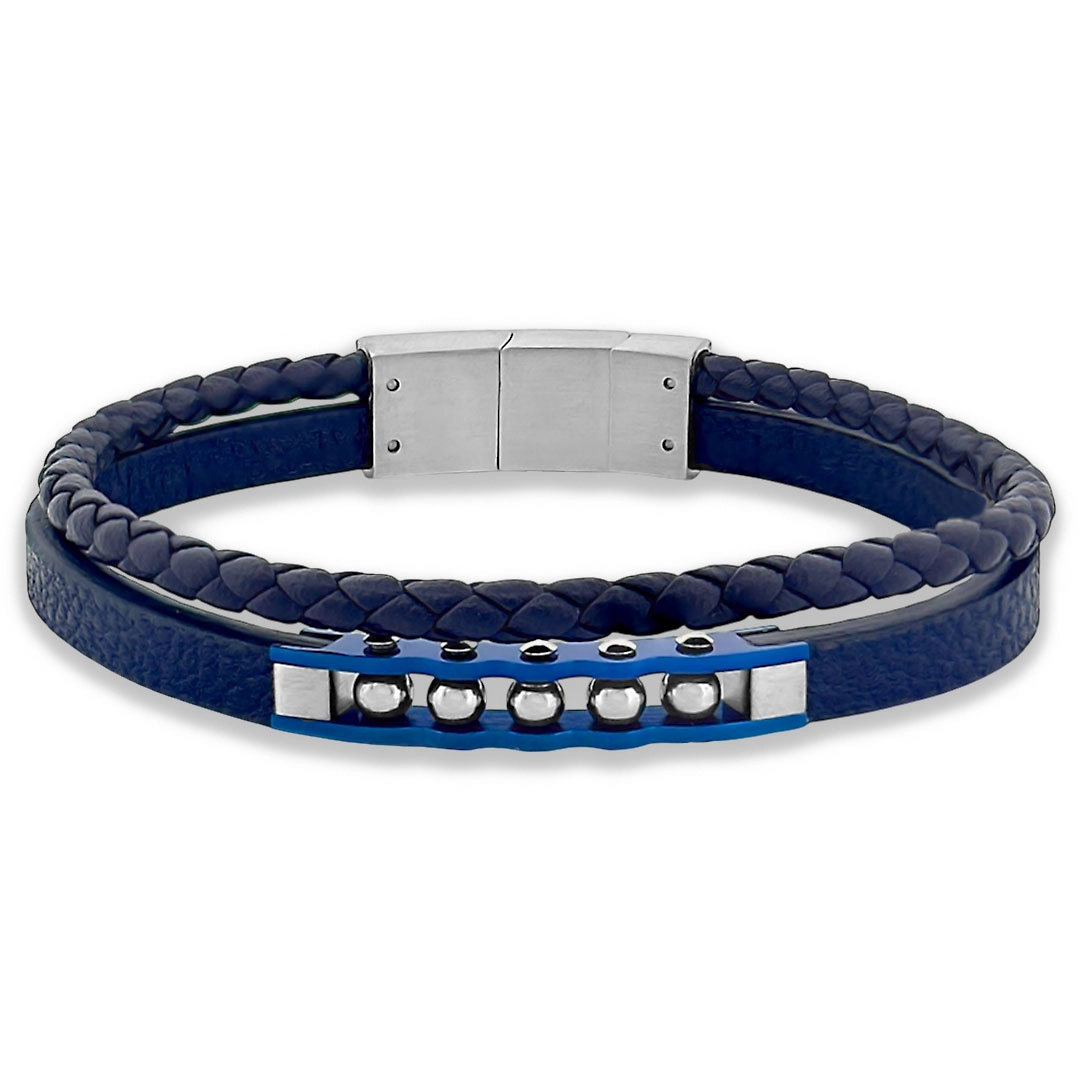 Bracelete de Aço com Dois Fios de Couro Azul e Placa
