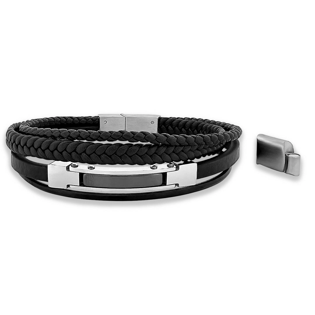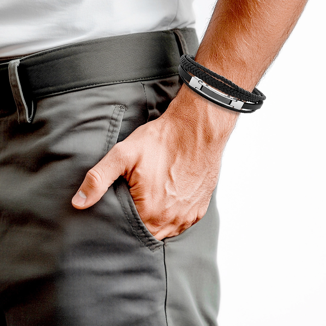 Bracelete de Aço com Quatro Fios em Couro Preto e Placa