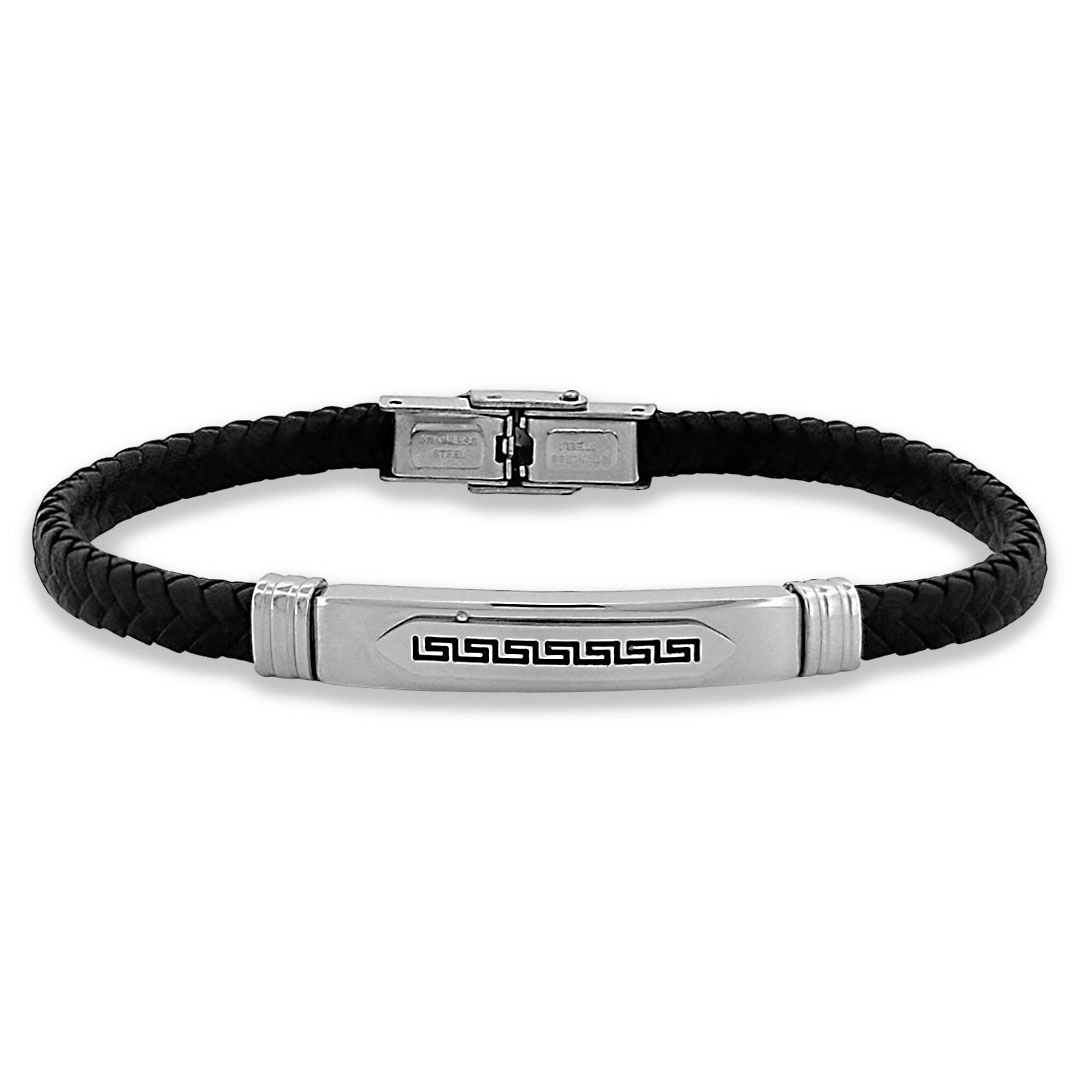 Bracelete de Aço Couro Preto Trançado Com Placa Trabalhada