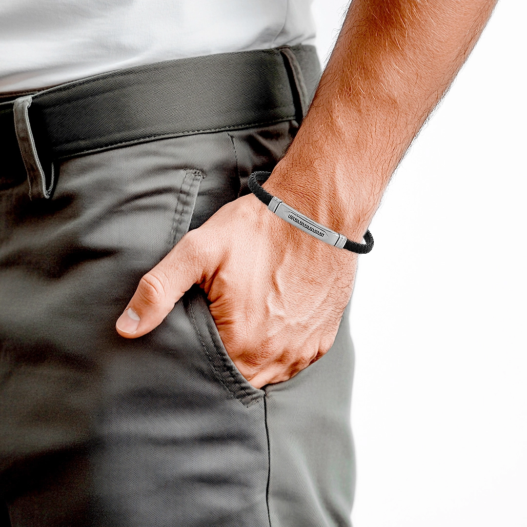 Bracelete em couro preto trançado e placa com trabalhado carbonado.