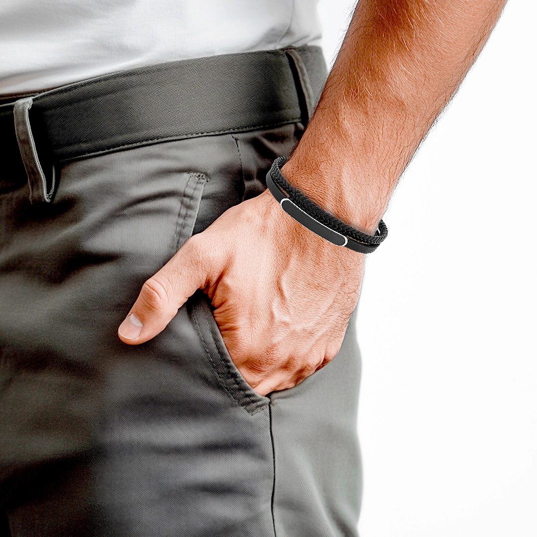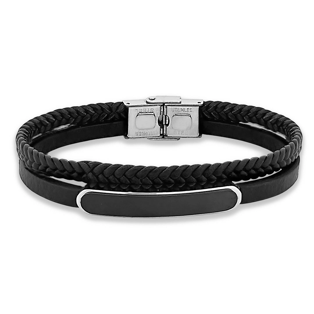 Bracelete duplo couro preto trançado com placa caronada espelhada.