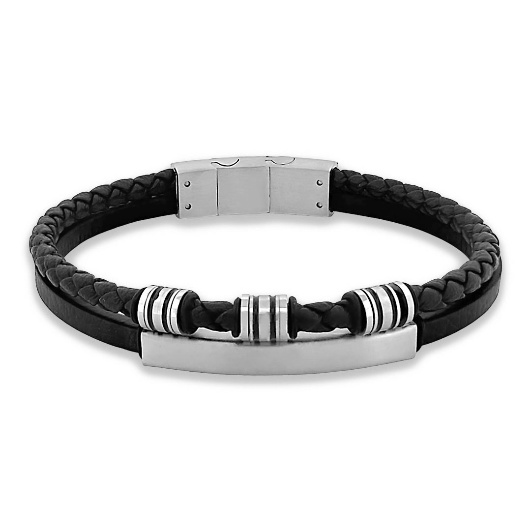Bracelete de Aço Duplo Couro Preto Trançado Com Placa Fosca