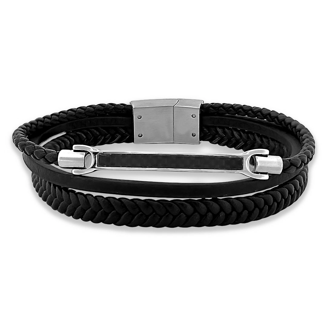 Bracelete com três fios em couro preto liso e trançado com placa carbonada trabalhada.