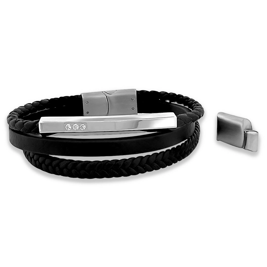 Bracelete de Aço Triplo Couro Preto Liso e Trançado Com Placa Espelhada e Zircônia Cristal