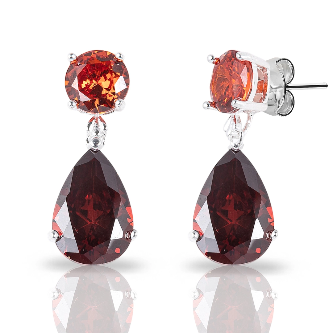 Brinco balanço com zircônias granada em formato redondo e gota.