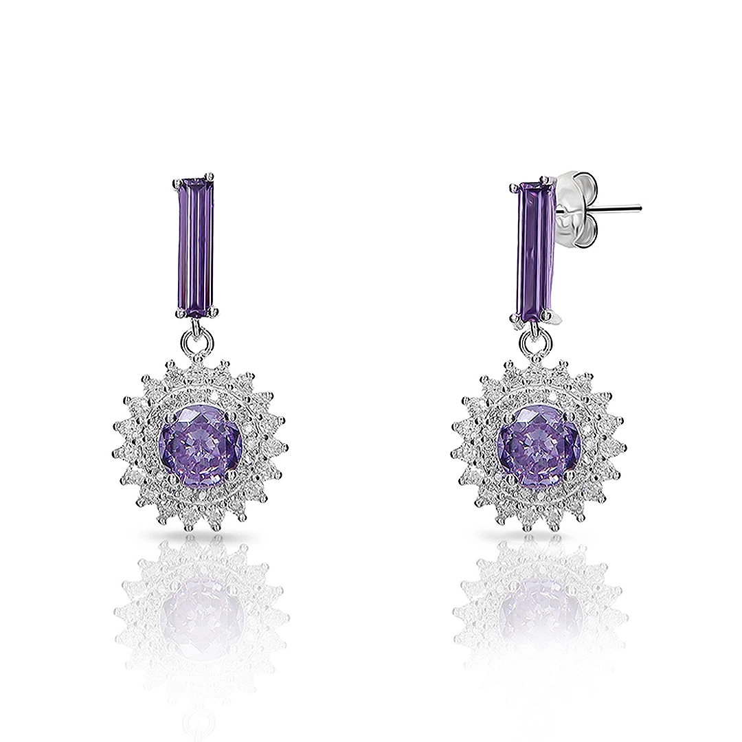 Brinco balanço com zircônias ametista em formato redondo e retangular.