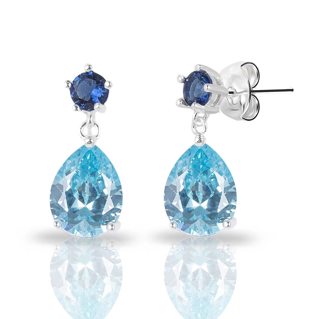 Brinco balanço com zircônias topázio e safira nos formatos redondo e gota.