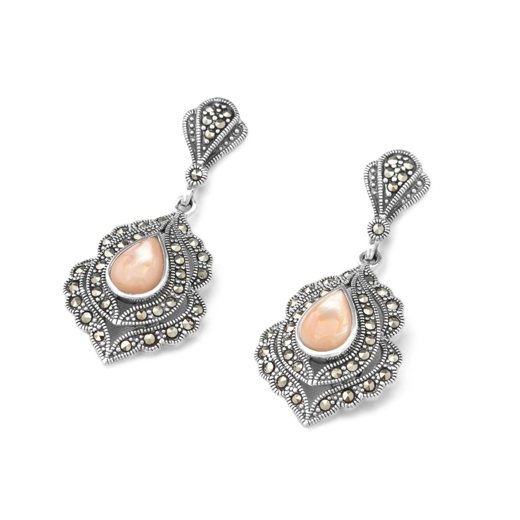 Brinco balanço em formato de gota com madrepérola rosa e marcassitas.