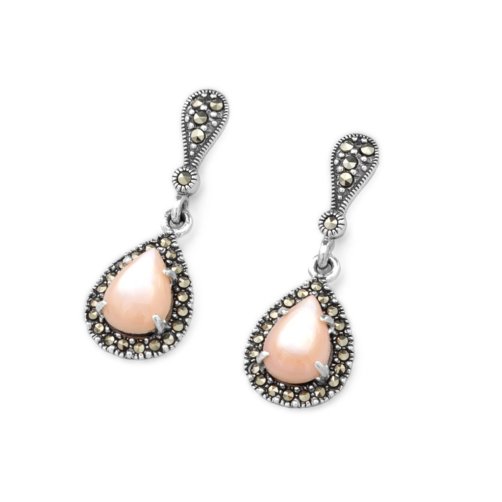 Brinco balanço em formato de gota com madrepérola rosa e marcassitas.