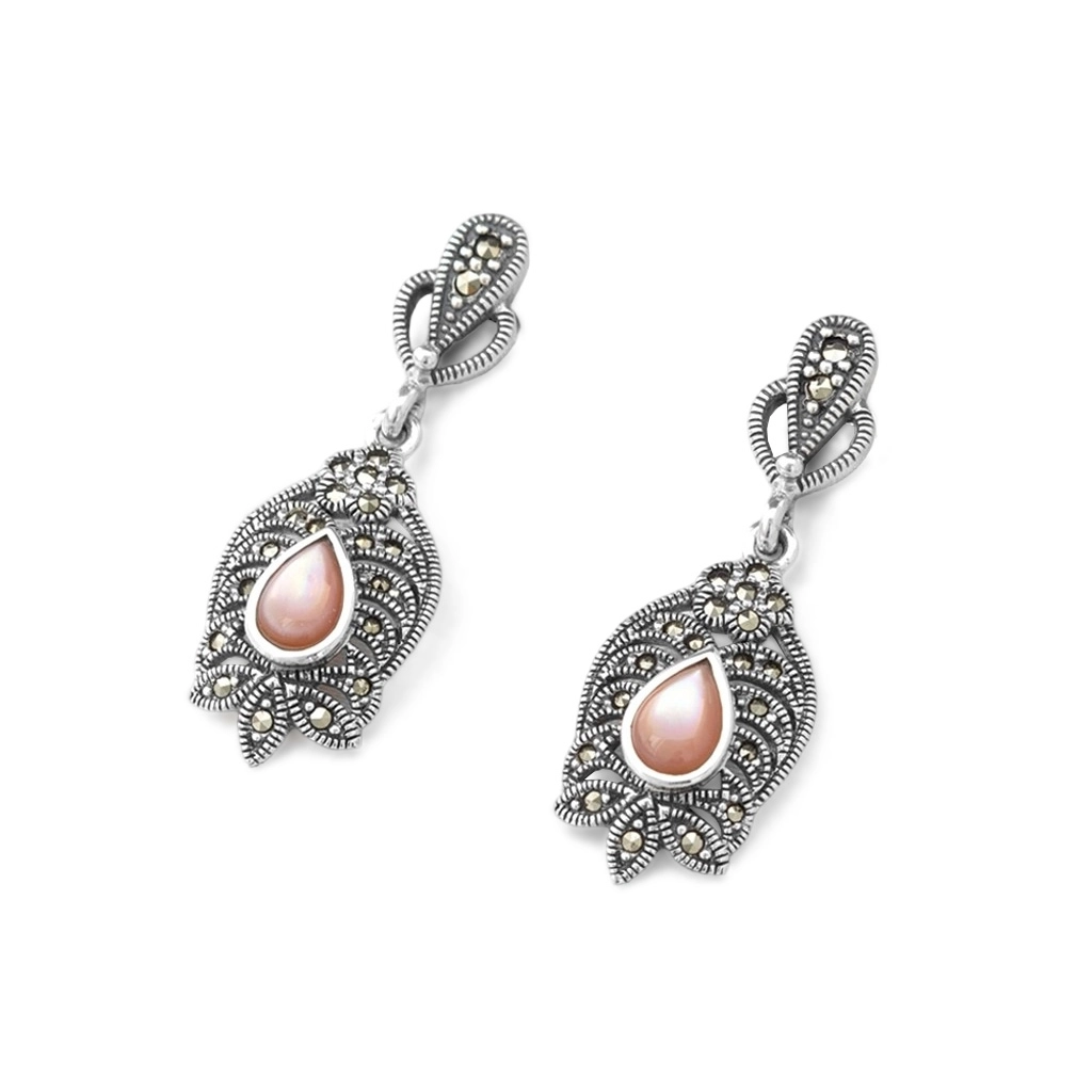 Brinco balanço em formato de gota com madrepérola rosa e marcassitas.