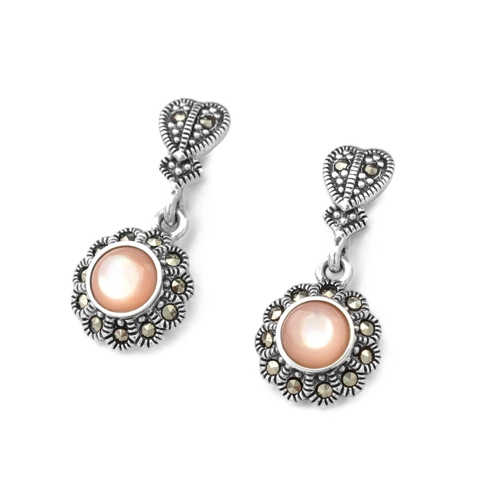 Brinco balanço em formato redondo com madrepérola rosa e marcassitas.