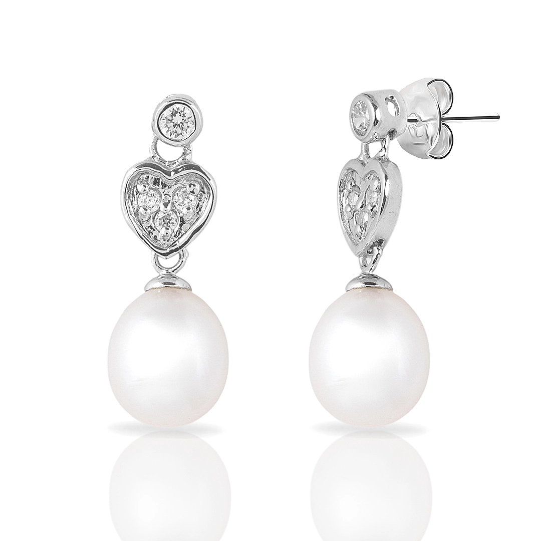 Brinco de Prata Balanço com Pérola Biwa e Coração Com Zircônias Cristal