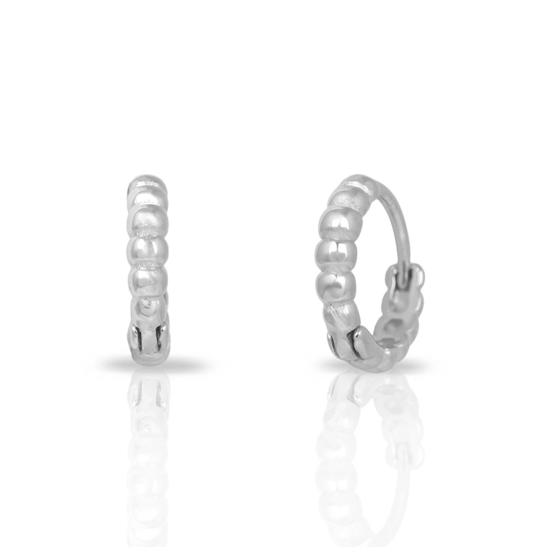 Brinco de argola clic com esferas espelhadas em tamanho médio.