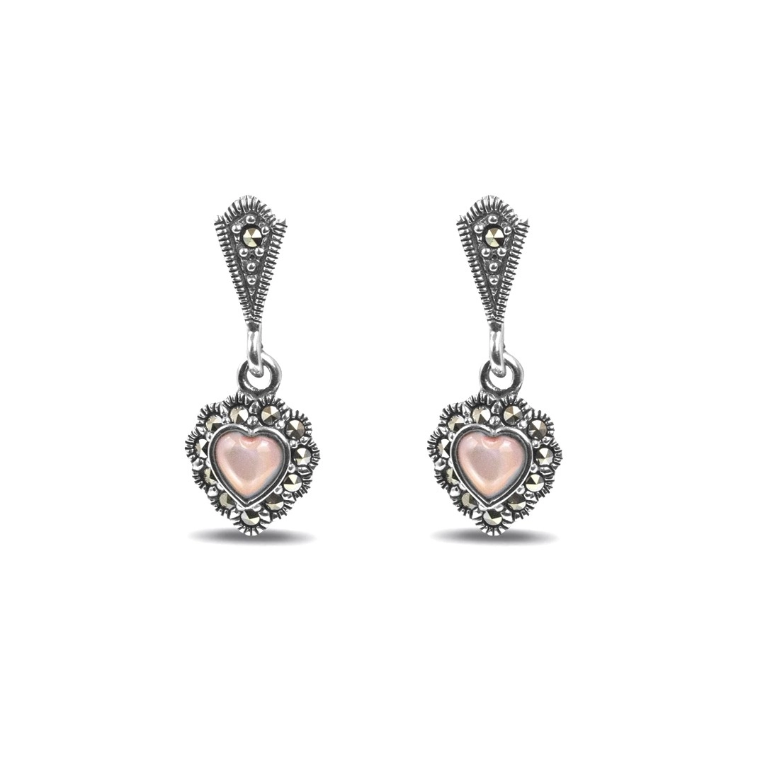 Brinco de Prata Coração com Madrepérola Rosa e Marcassitas