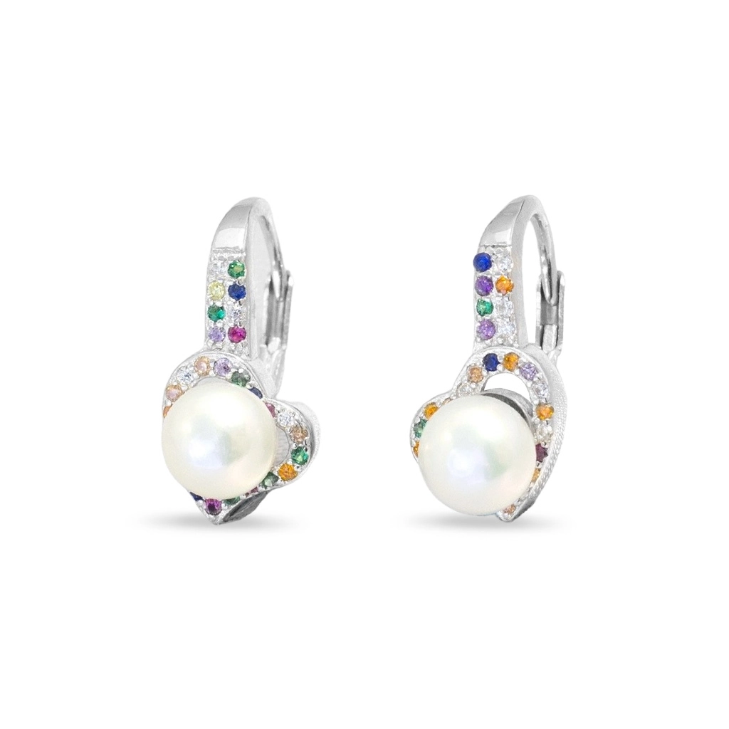 Brinco de Prata Coração com Zircônia Colorida e Pérola Biwa
