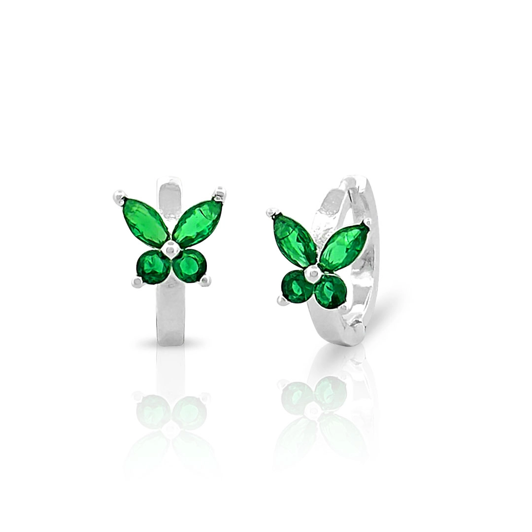 Brinco de Prata Leve Argola Clic Com Borboleta e Zircônias Esmeralda