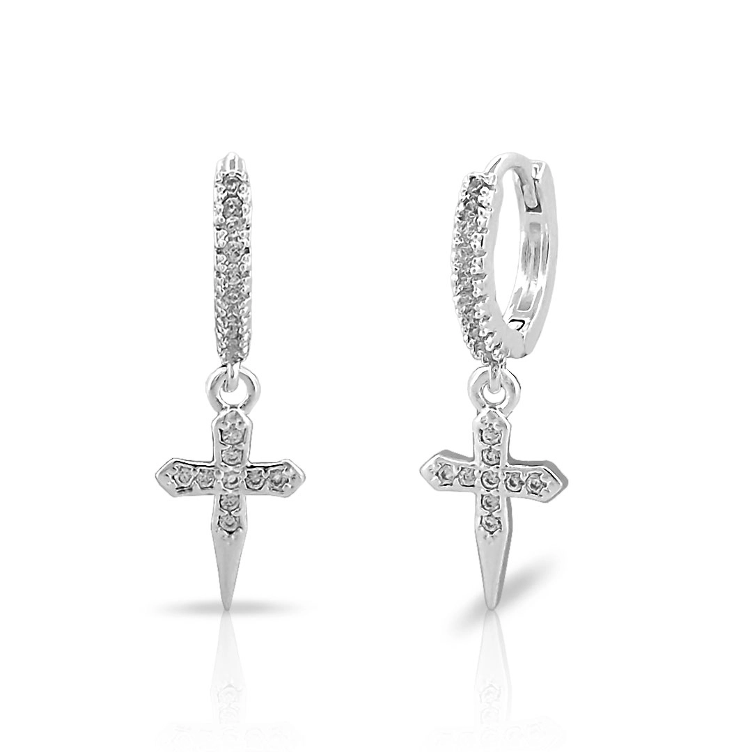 Brinco de argola clic com pingente de cruz.