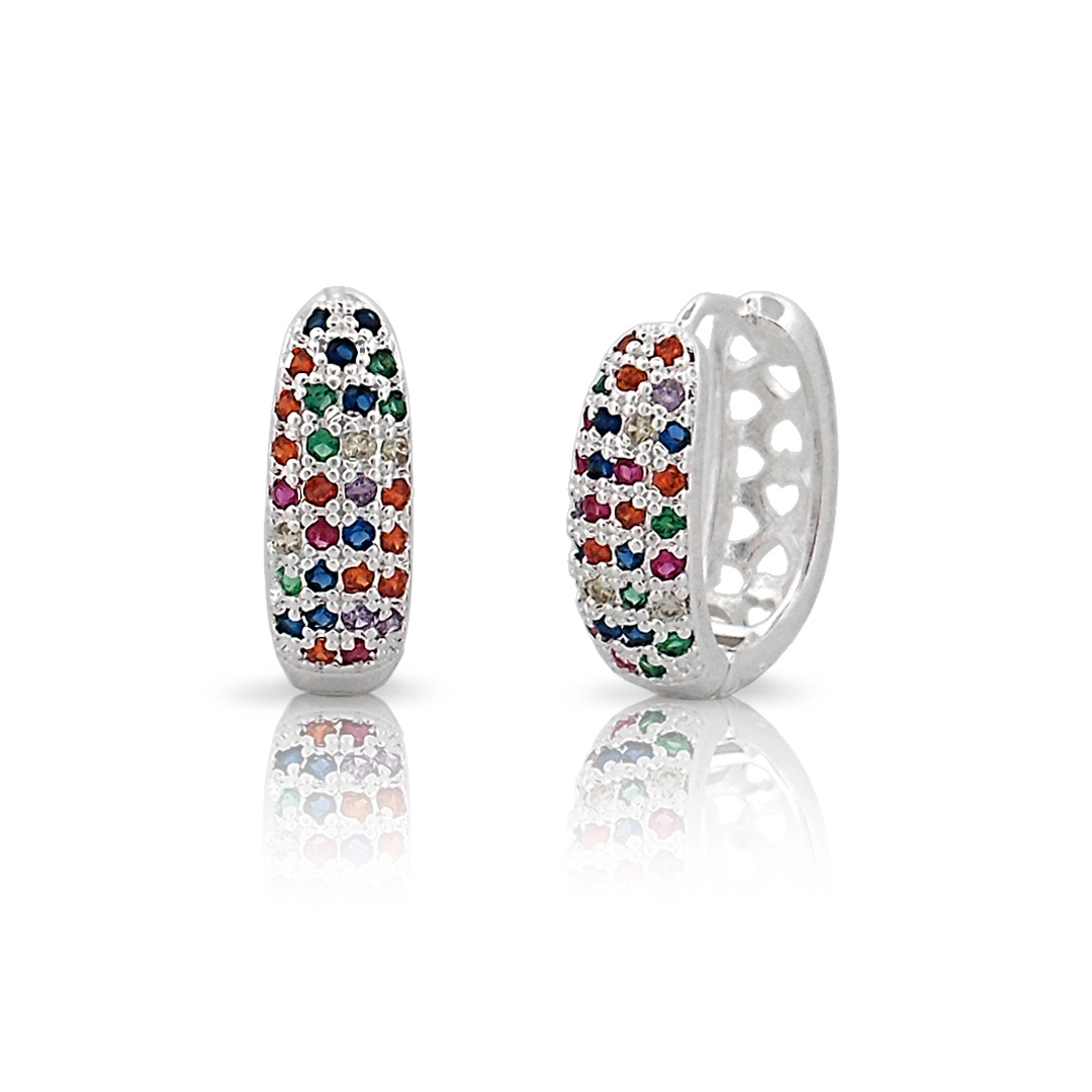 Brinco de Prata Leve Argola Clic Oval com Zircônias Coloridas Cravejadas
