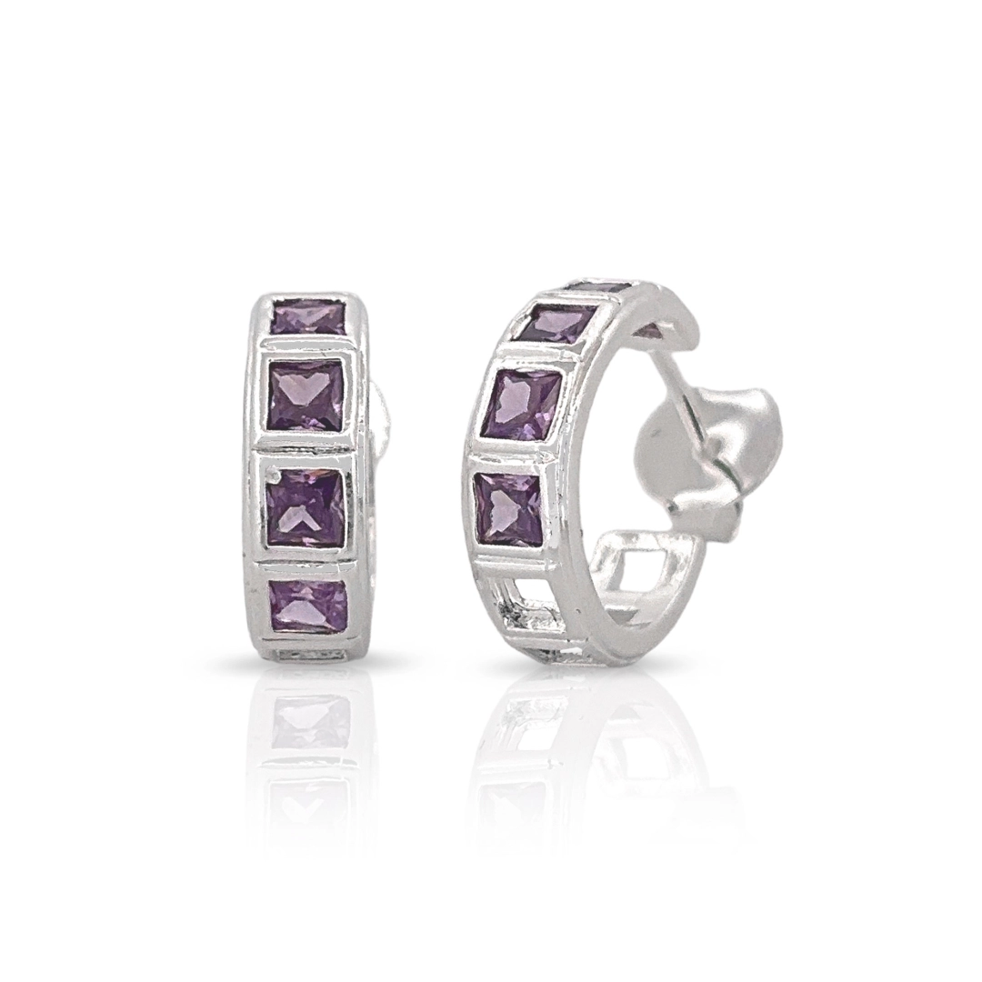 Brinco De Prata Leve Argola com Zircônias Quadradas Ametista